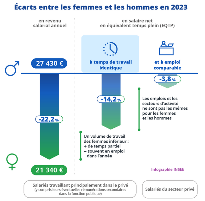 Une étude de l’INSEE de 2023 montre que les femmes représentent 42 % des postes salariés du privé en équivalent temps plein, mais seulement 24 % des 1 % des postes les plus rémunérés. Elles gagnent en moyenne 22% de moins que les hommes.